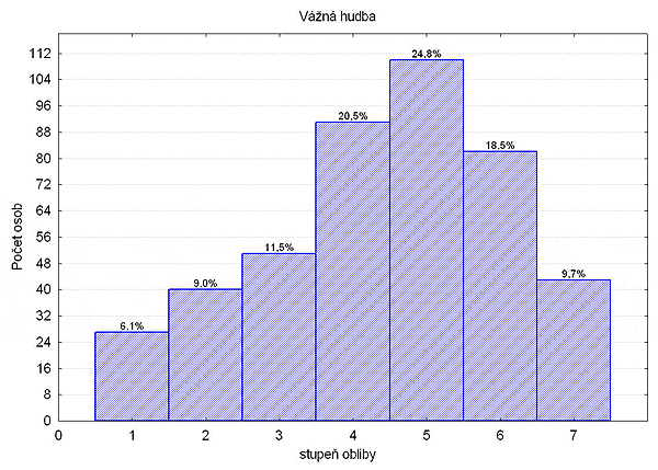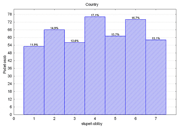 Nejprve jsme seřadili hudební žánry podle stupně oblíbenosti. Zjištěné pořadí je uvedeno v tabulce 2. Pokud srovnáme pořadí oblíbenosti zjištěné v naší studii s pořadím, které uvádí Bekova (2005) práce provedená na reprezentativním vzorku populace ČR, vidíme, že začátek obou řad je - s jedinou výjimkou - přibližně stejný. Touto výjimkou je hudba country, která stojí v Bekově vzorku na prvním místě obliby. Rozdíly se pak dále objevují v umístění vážné hudby, lidové hudby a dechovky. Vážná hudba má v našem zkoumaném souboru poněkud větší oblibu oproti pořadí zjištěném v Bekově vzorku, zatímco lidová hudba a dechovka stojí na konci řady, které v Bekově studii obsazuje heavy metal. Rozdíly jsou dány nepochybně věkovým složením obou vzorků - zatímco Bek pracoval s reprezentativním zastoupením všech věkových kategorií, v našem vzorku byli poněkud mladší respondenti s vyšším vzděláním.